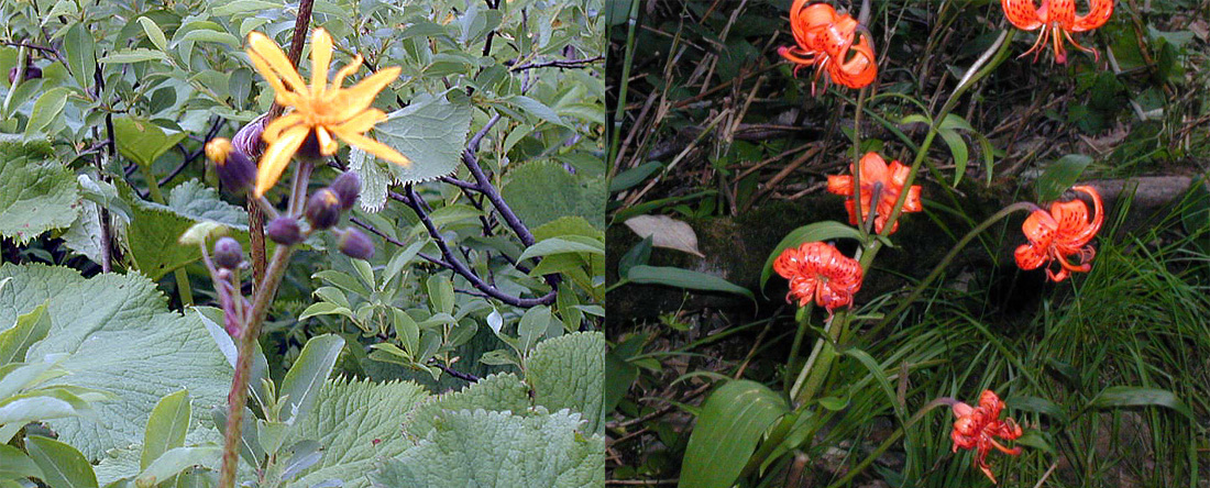 頂上近くに咲いていた花、左の黄色い花はミヤマダケブキ、右の赤い花はクルマユリです。