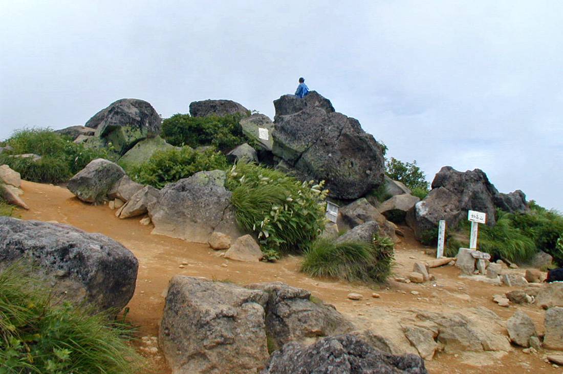 頂上を示す標識と三角点は一番高い岩の少し下にありました。(左) 残念ながら頂上から西側は雲に覆われ眺望はなしでした。(右)