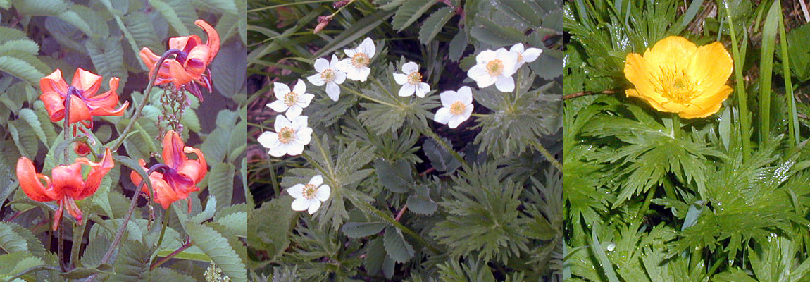 鉢が岳周辺で撮影した高山植物の写真です。比較的どの高山でも見られる種類で、下左がクルマユル、中がハクサンイチゲ、右がシナノキンバイです。
