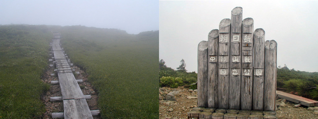 霧がかかって来た木道を行くと頂上はもうすぐです。 右下は標高2418mの白馬朝日岳頂上の大きな標識です。