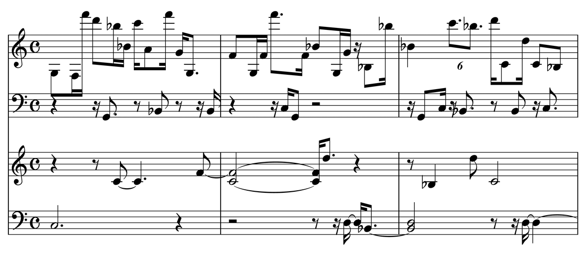 | 自作の自動作曲プログラムの実行結果を標準MIDIファイルに変換し、楽譜作成ソフトFinaleで読み込んだまま手を加えていない楽譜。 上記では5音音階の出現確率が高く設定されているが、12の音すべてを平均的に出力するように設定すると、出力された音群は完全な無調となる。 |